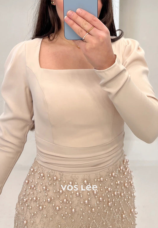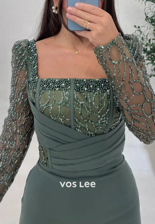 Long Sleeve Square Beaded Embellished Ankle-Length Mermaid Evening Dresses