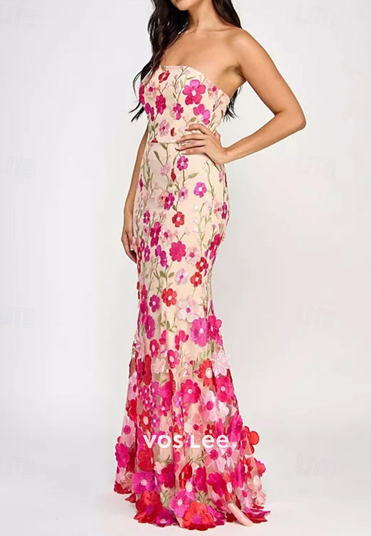 A-Line Strapless Floral Appliqued Embellished Floor-Length Pleated Evening Dresses