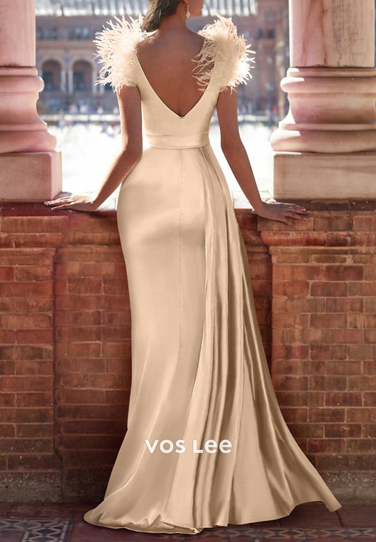 Sexy and Sleek V Neck Feather Pleated Mermaid Evening Dresses with Sweep Train