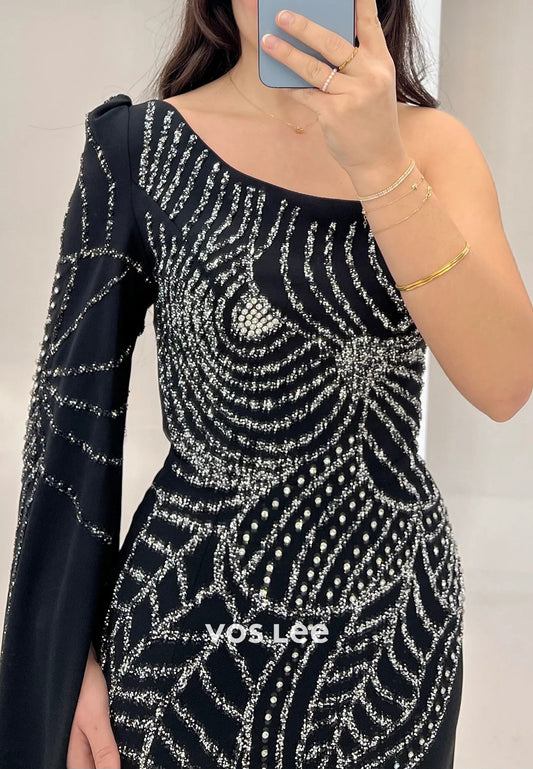 Long Sleeve One Shoulder Rhinestone Pleated Mermaid Evening Dresses with Sweep Train