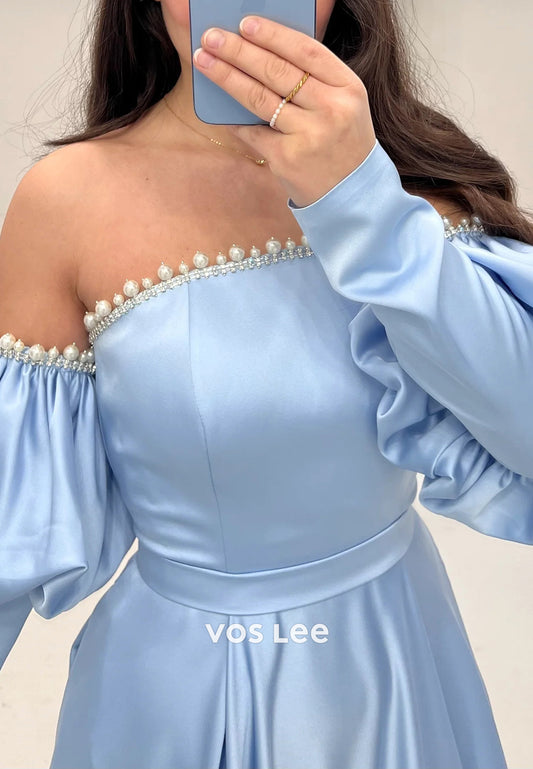 A-Line Long Sleeve Off the Shoulder Pearls Prom Dresses Evening Dresses with Sweep Train
