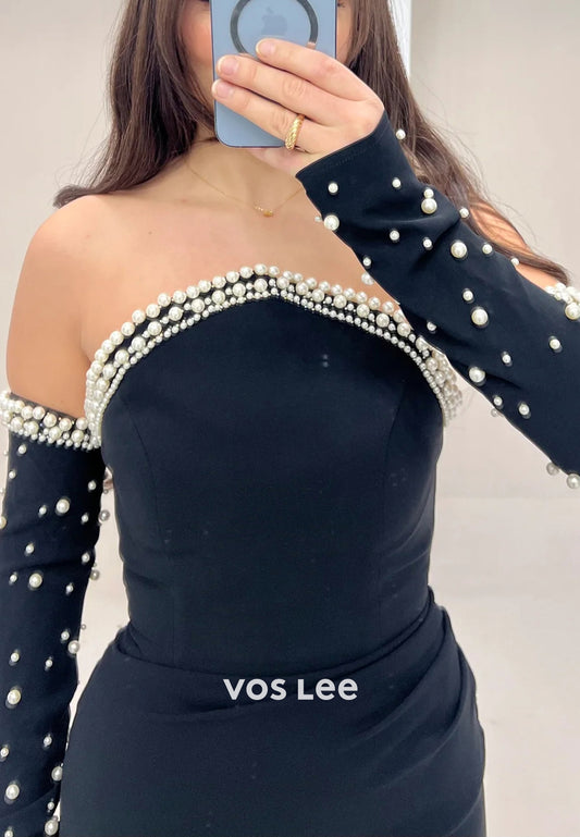 Simple Long Sleeve Strapless Pearls Floor-Length Mermaid Evening Dresses with Split