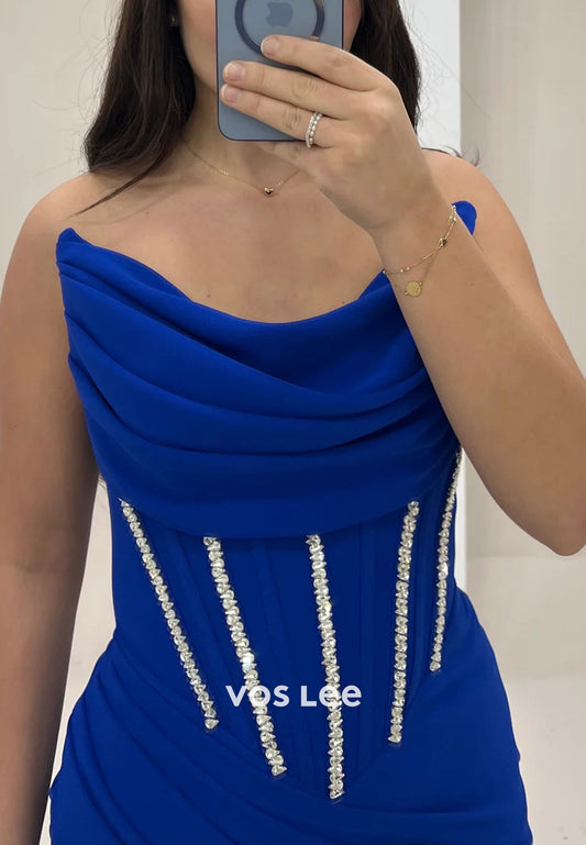 Strapless Sweetheart Rhinestone Pleated Mermaid Evening Dresses with Sweep Train