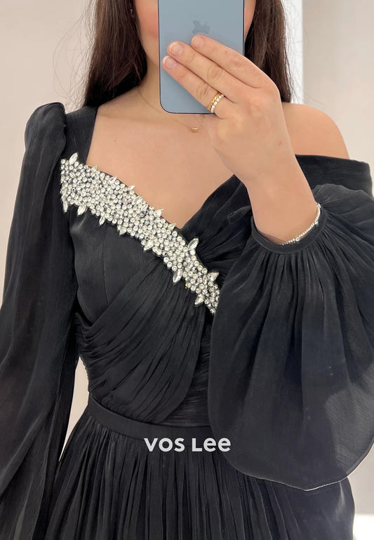 Long Sleeve V Neck Rhinestone Embellished Pleated Evening Dresses with High Split