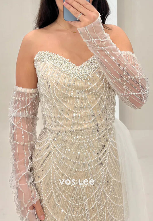 Long Sleeve Sweetheart Fully Sequined Beading Mermaid Evening Dresses with Sweep Train