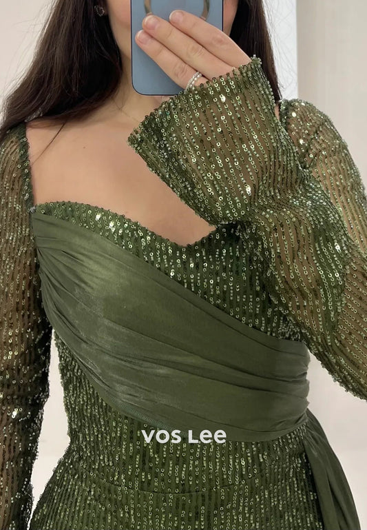 Long Sleeve Sweetheart Fully Sequins Beaded Floor-Length Mermaid Evening Dresses