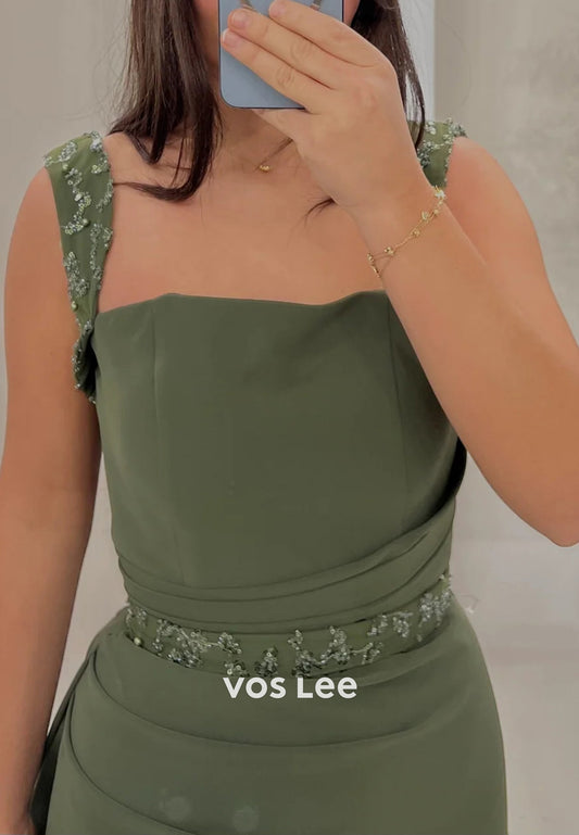 Spaghetti Straps Square Sequins Beaded Pleated Mermaid Evening Dresses with Court Train