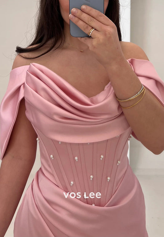 Simple & Classic Off the Shoulder Pearls Pleated Mermaid Evening Dresses with High Split