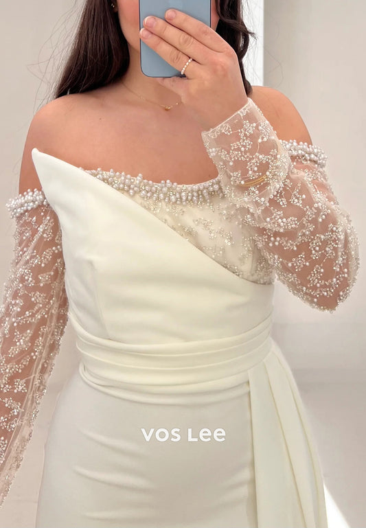 Long Sleeve Off the Shoulder Beading Pleated Mermaid Evening Dresses with Sweep Train