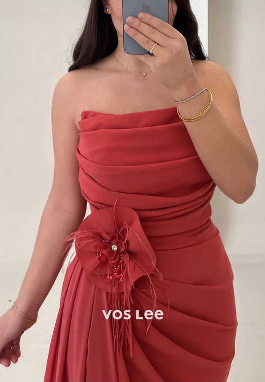 Classic Strapless Flowers Embellished Pleated Mermaid Evening Dresses with Sweep Train