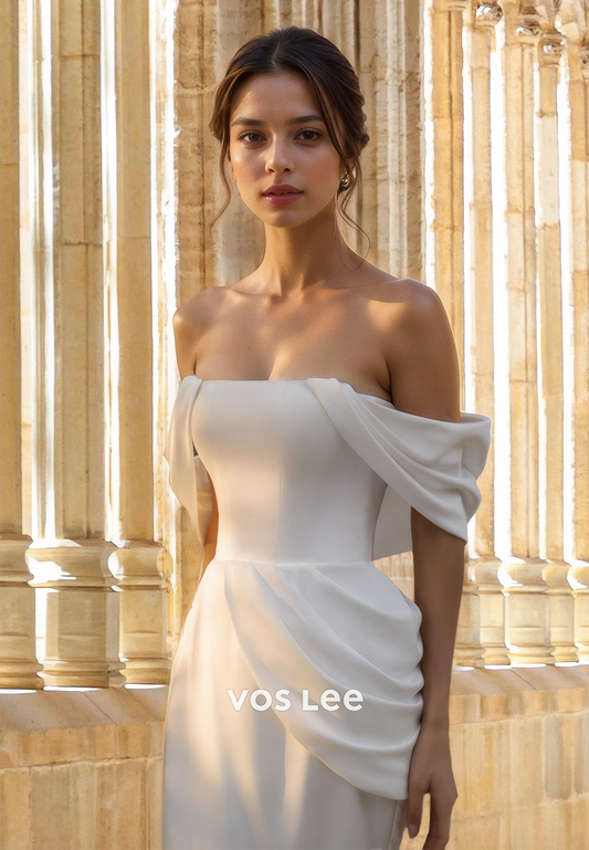 Simple Column Off Shoulder Back Zipper Court Train Ruched Satin Wedding Dress