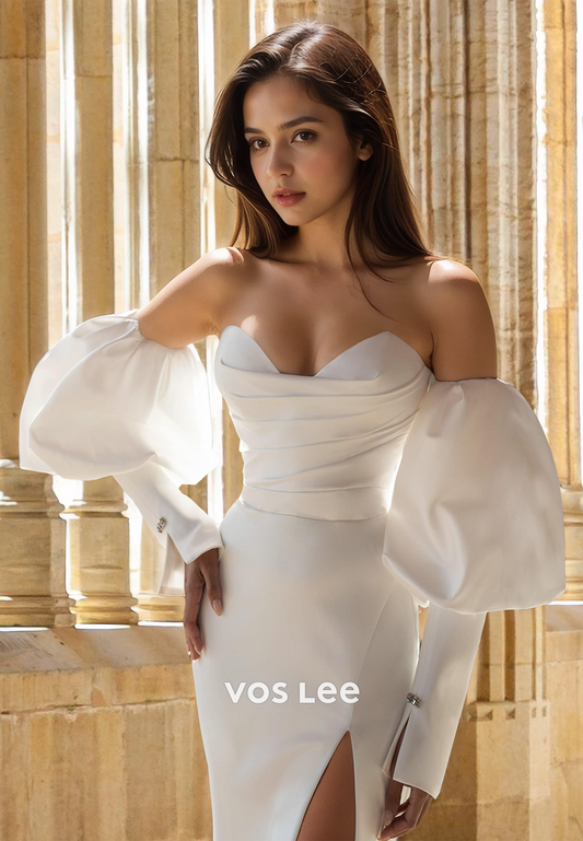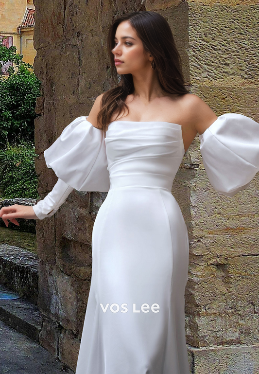 Modest Column Puff Sleeves Strapless Ruched Satin Wedding Bride Dress