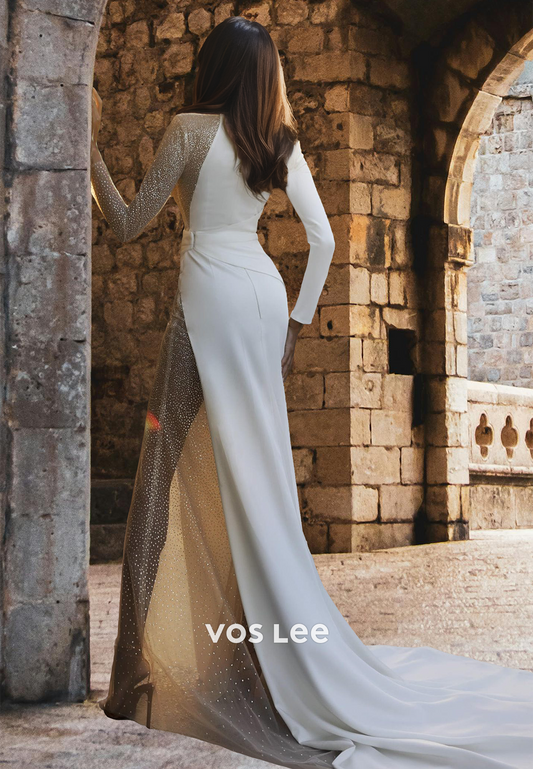 Unique Sheath High Neck Long Sleeves Court Train Sequins Wedding Dress