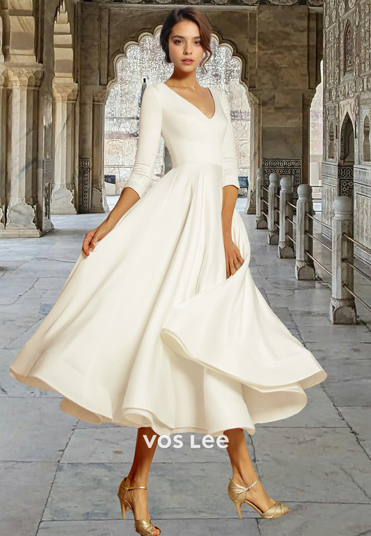 Elegant A-Line V Neck Back Zipper Tea Length Draped Satin Wedding Guest Dress