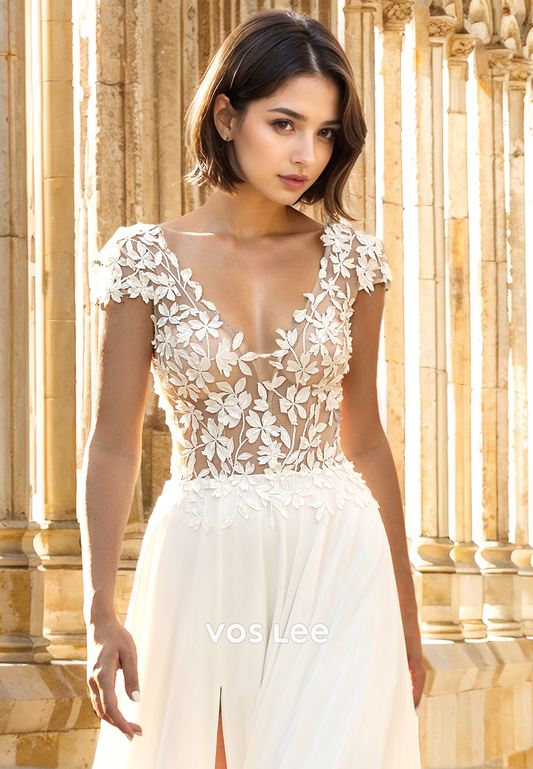 Ornate Deep V Neck Short Sleeveless High Split Lace Appliques Satin Wedding Dress