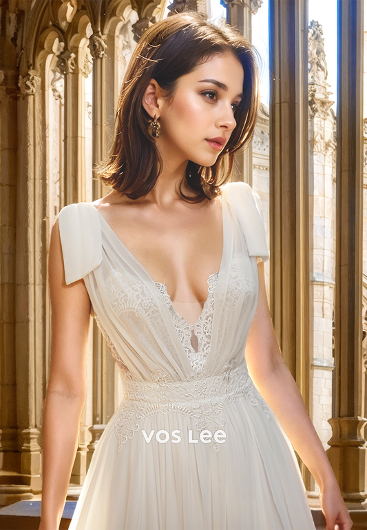 Modest Deep V Neck Spaghetti Straps A-Line Pleated Lace Appliques Wedding Dress