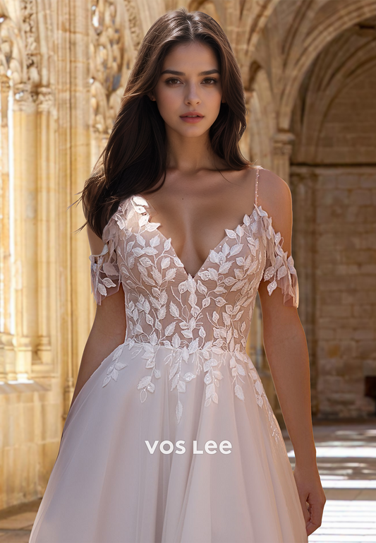 Charming A-Line V Neck Spaghetti Straps Backless Lace Appliques Tulle Wedding Dress