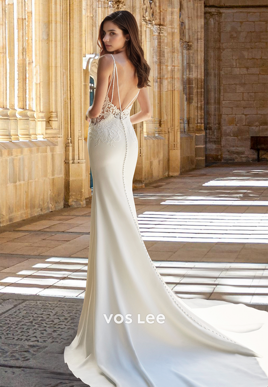 Graceful Sheath V Neck Spaghetti Straps Lace Appliques Court Train Wedding Dress