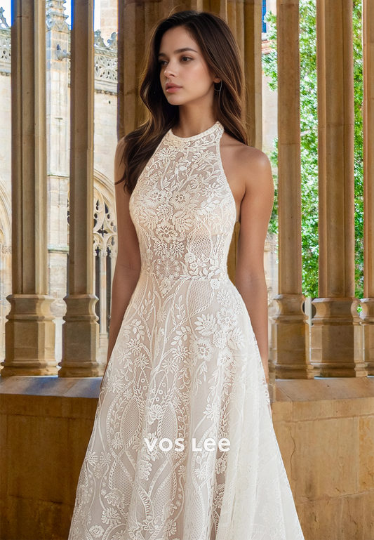 Luxury A-Line Halter Sleeveless Backless Court Train Lace Appliques Wedding Gown