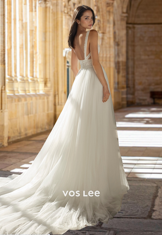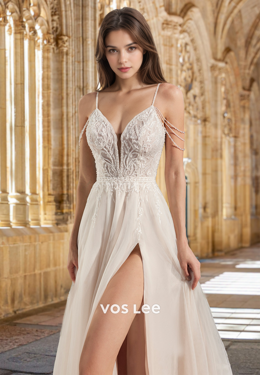 Ornate A-Line V Neck Spaghetti Straps Backless High Split Tulle Wedding Gown