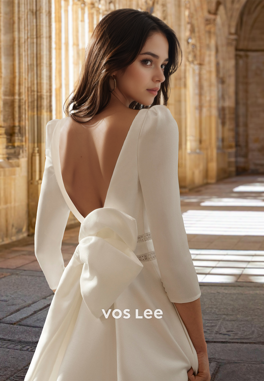 Vintage A-Line Square Neck Long Sleeves Satin Ruched Wedding Dress with Split