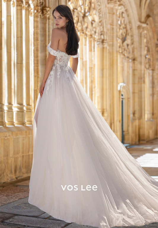 Ornate Off Shoulder A-Line Lace Appliques Back Zipper Tulle Wedding Gown