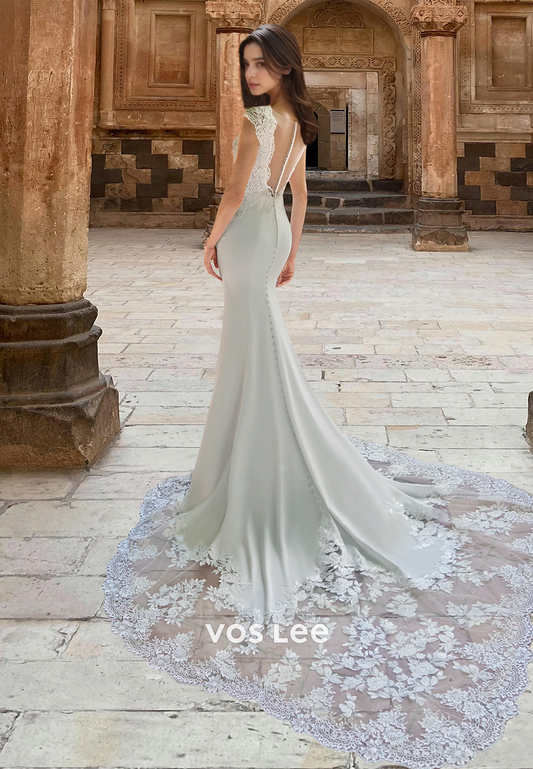 Graceful V Neck Cap Sleeves Mermaid Lace Appliques Satin Wedding Bride Dress