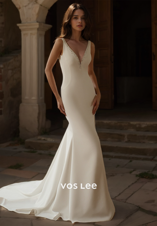 Elegant V Neck Straps Backless Column Sweep Train Beaded Satin Wedding Dress
