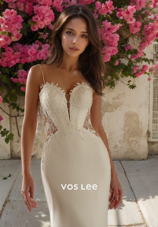 Meimaid Luxury Column Spagherri Straps Lace Appliques Sweep Train Wedding Dress
