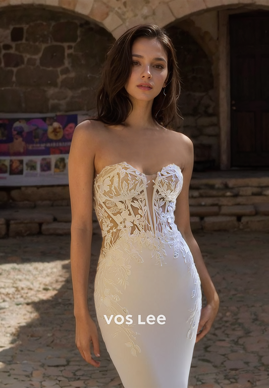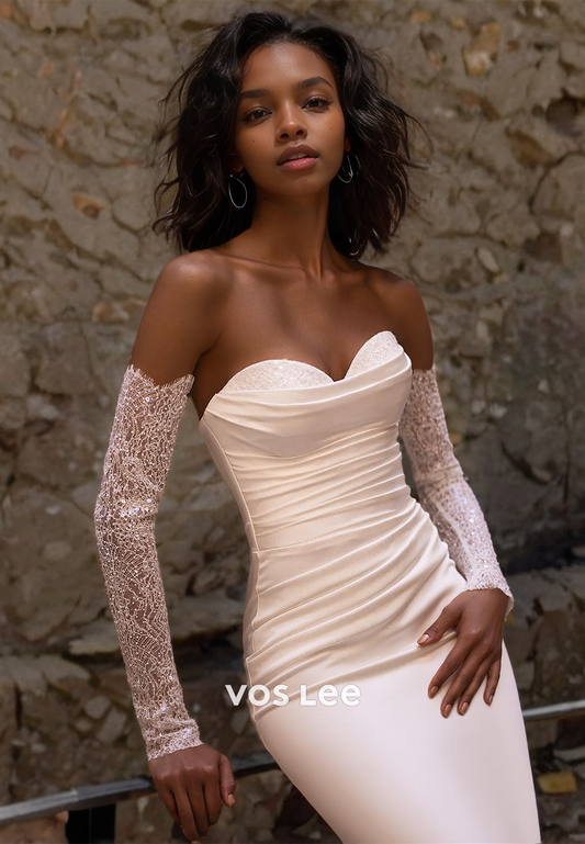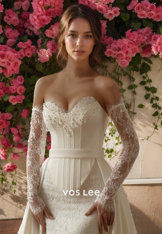 Mermaid Graceful Sweetheart Long Sleeves Lace Appliques Beaded Sparkly Wedding Dress