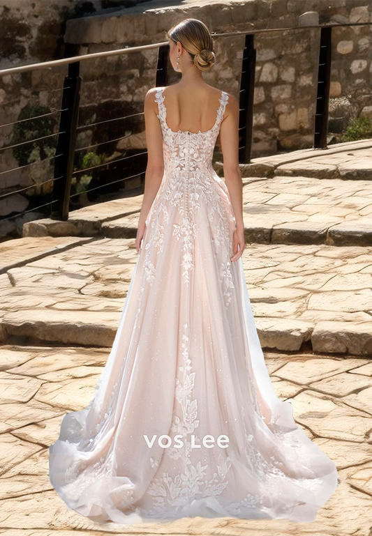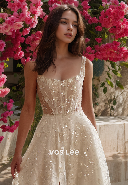 Charming Square Neck Straps Back Zipper High Split Beaded Lace Appliques Wedding Dress Glitter