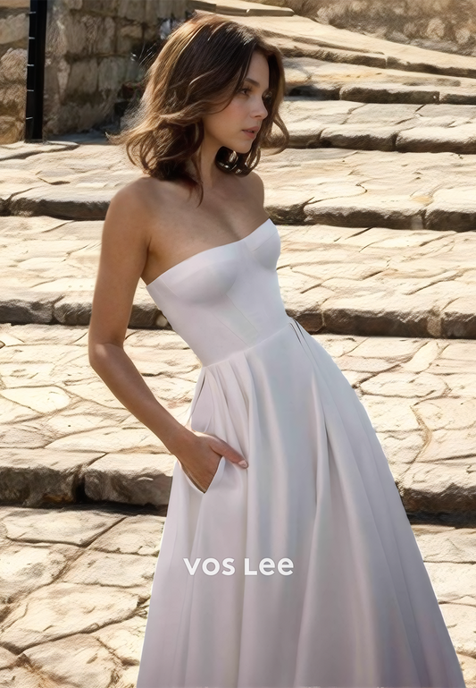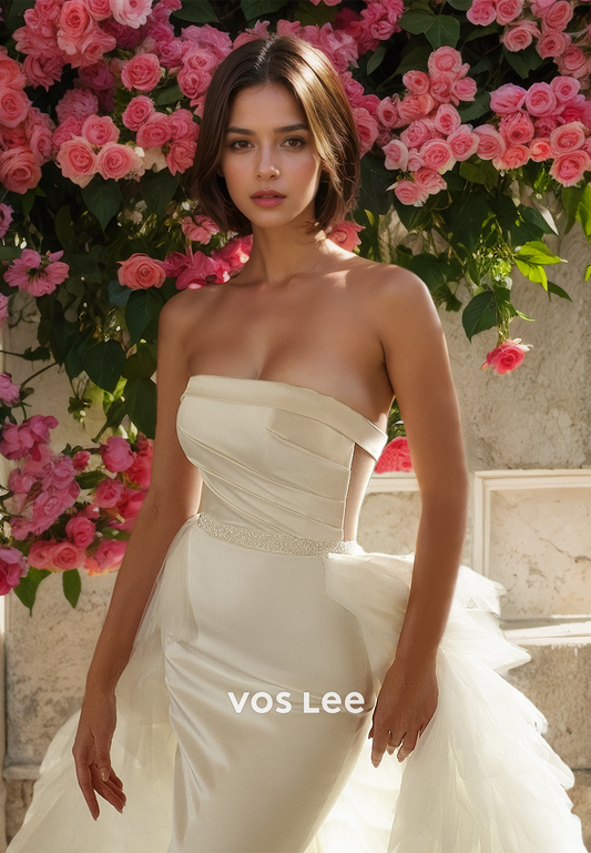 Mosest Strapless Back Zipper Sleeveless High Split Sweep Train Satin Wedding Gown