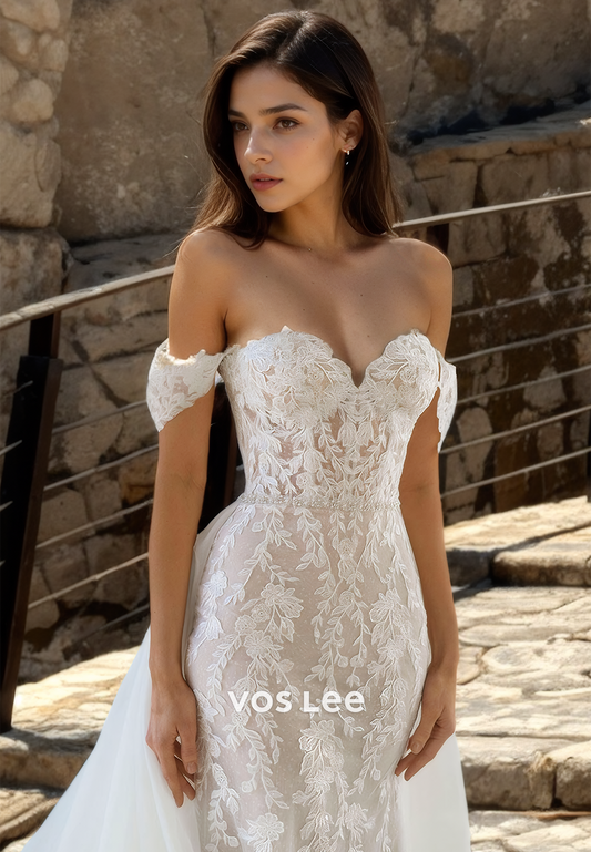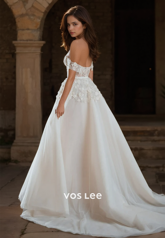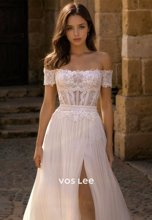 Elegant A-Line Off Shoulder Lace Appliques High Split Backless Tulle Wedding Dress