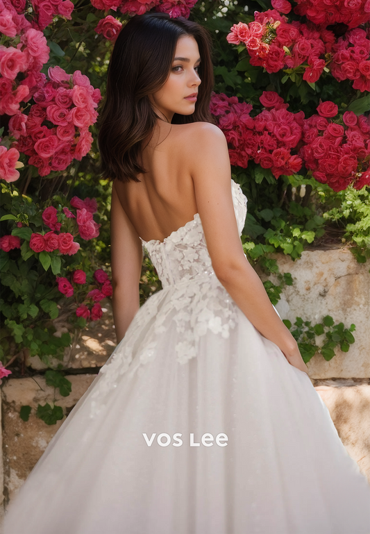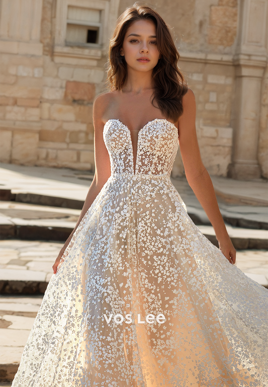Luxury Deep V Neck Back Zipper A-Line Sleeveless Lace Appliques Wedding Gown