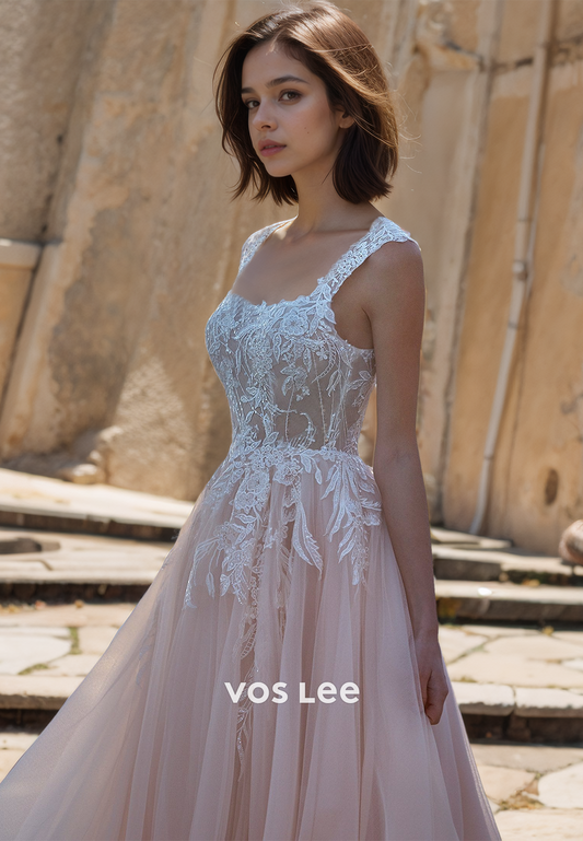 Charming Square Neck Straps Backless Lace Appliques Tulle Wedding Bride Dress