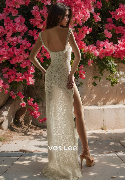 Gorgeous Sheath Spaghetti Straps Scoop Neck Backless High Split Lace Wedding Dress