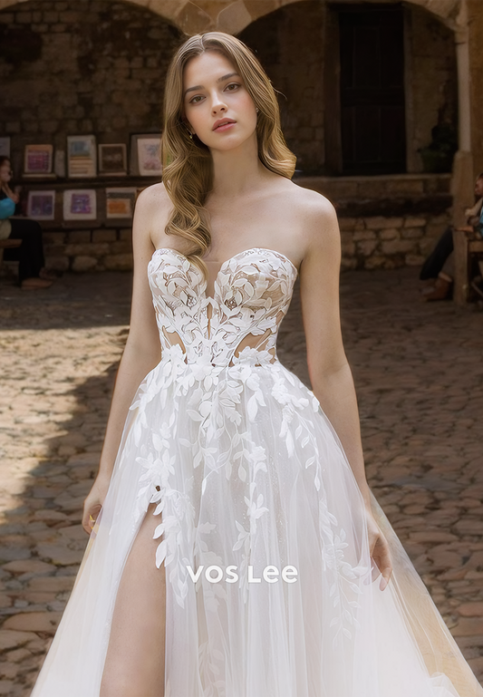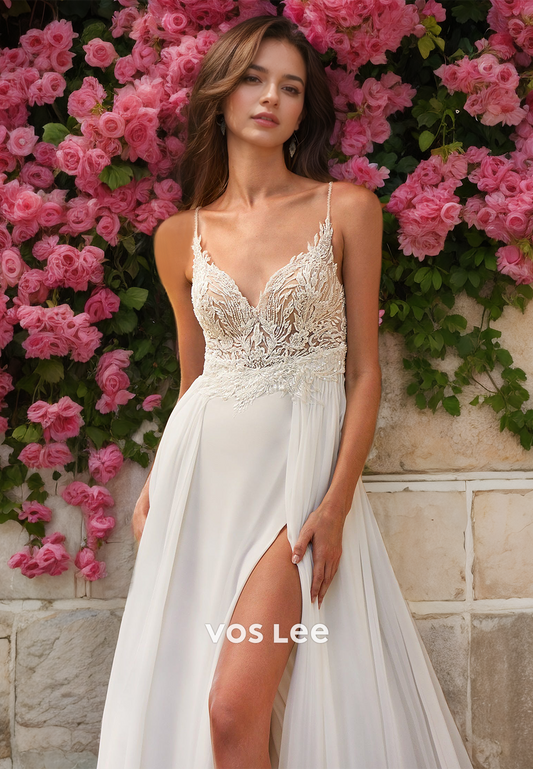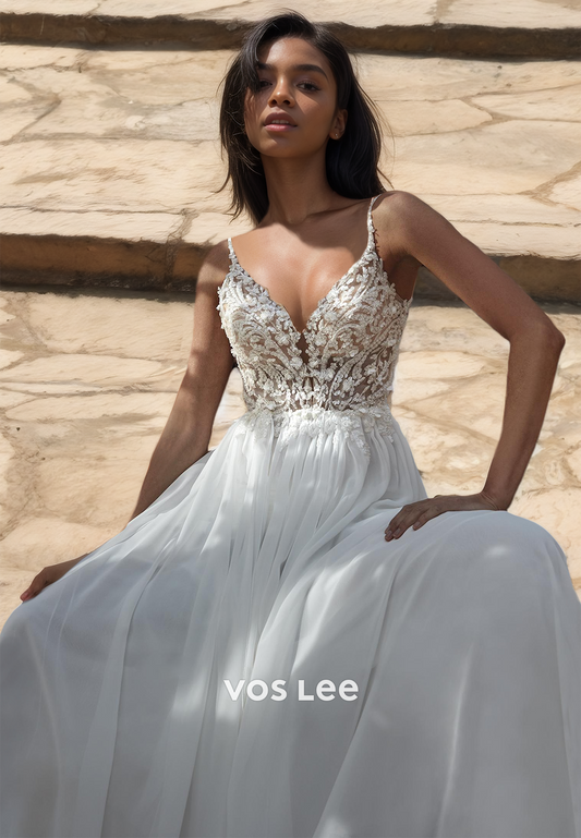 Sexy Spaghetti Straps Deep V Neck Lace Appliques High Split Tulle Wedding Dress