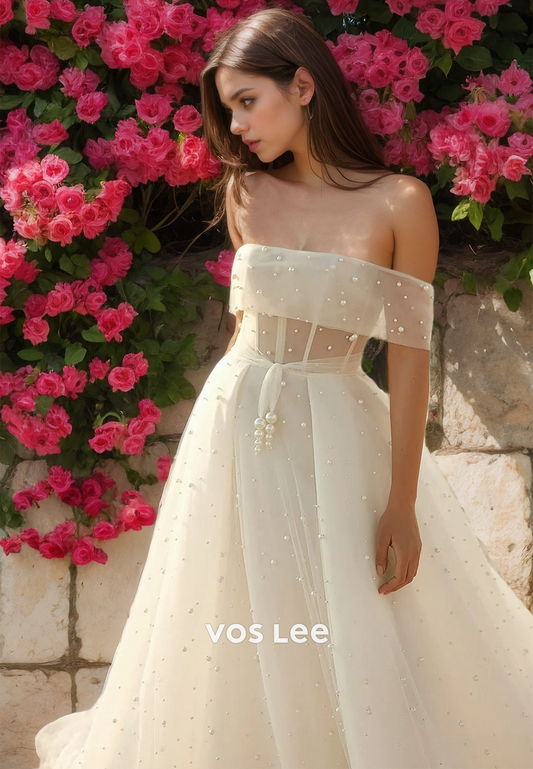 Graceful Off Shoulder A-Line Sleeveless Beaded Lace Appliques Tulle Wedding Gown