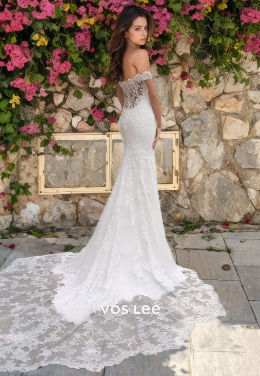 Gougeous Column Off Shoulder Lace Appliques Court Train Lace Up Wedding Gown