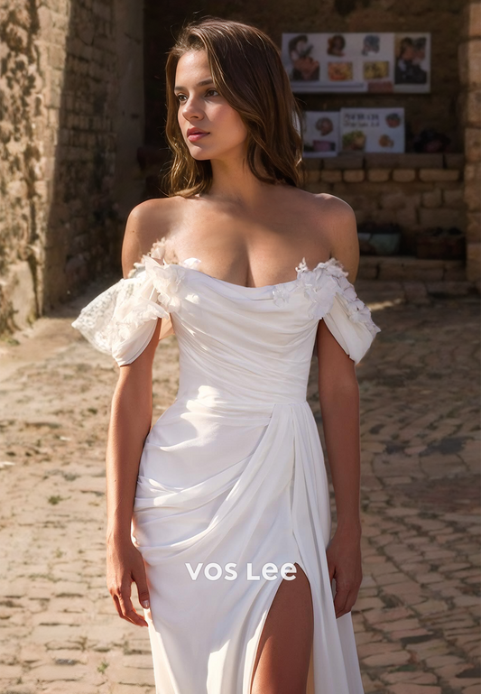 Ornate Sheath Off Shoulder Draped Sleeveless Floral Beaded High Split Satin Wedding Dress