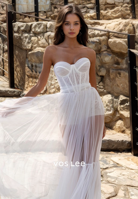 Unique Sweetheart A-Line Strapless Tulle Illusion Pleated Wedding Bride Dress