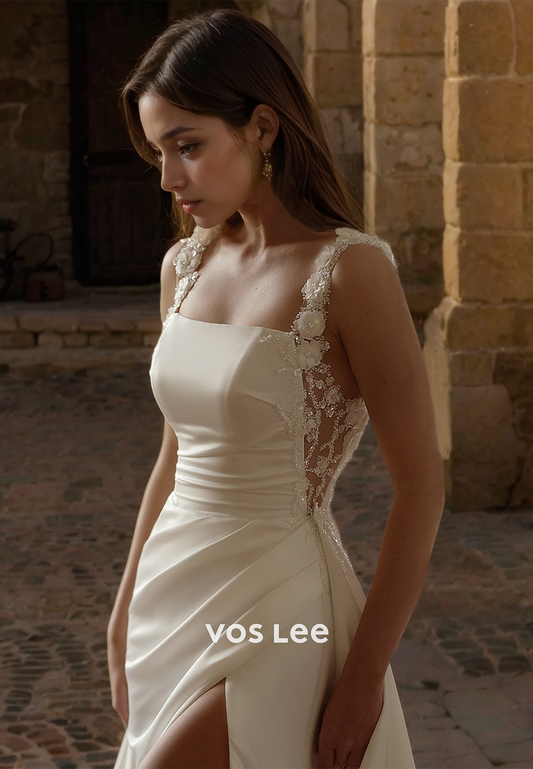 Unique Column Square Neck Spaghetti Straps 3D Floral Beaded Ruched Satin Wedding Dress with Split