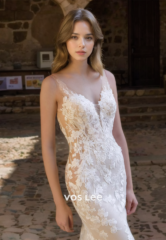 Gorgeous Sheath Deep V Neck Illusion Backless Court Train Beaded Lace Appliques Wedding Bride Gown