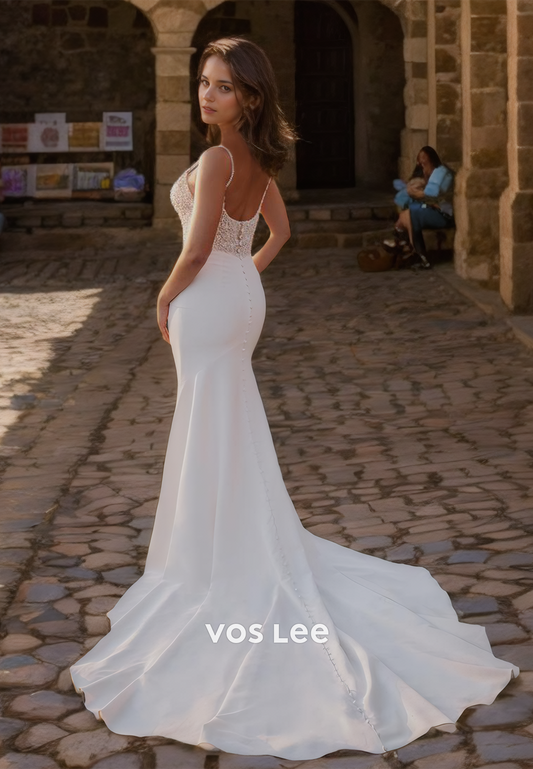 Mermaid Charming Column Scoop Neck Spaghetti Straps Beaded Backless Satin Wedding Dresss