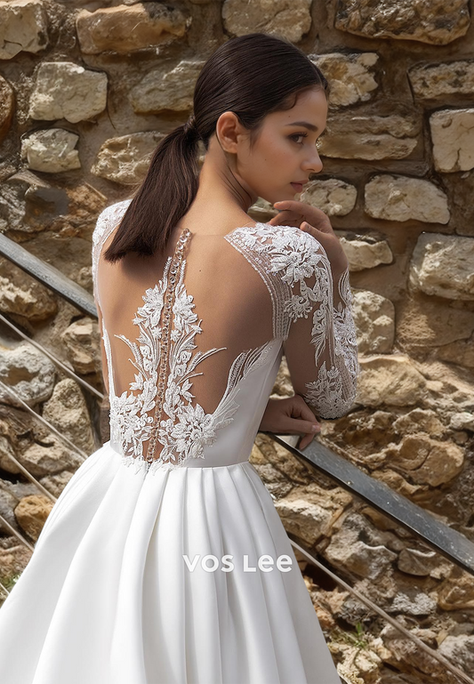 Elegant Long Sleeves Bateau A-Line Lace Appliques Pleated Court Train Satin Wedding Gown