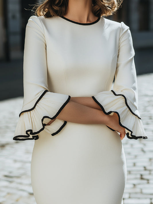 Ivory Flounce-Trim Midi Dress With Black Accents