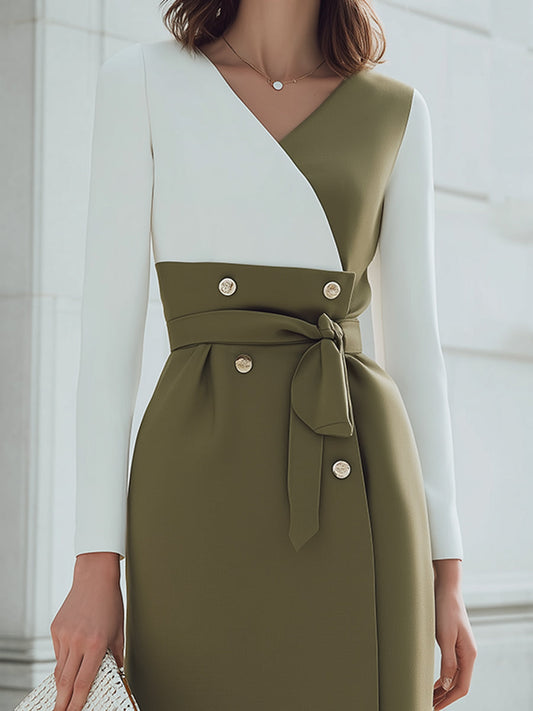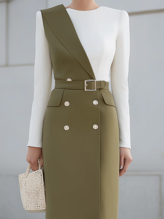 Olive Green And White Asymmetric Panel Belted Midi Dress