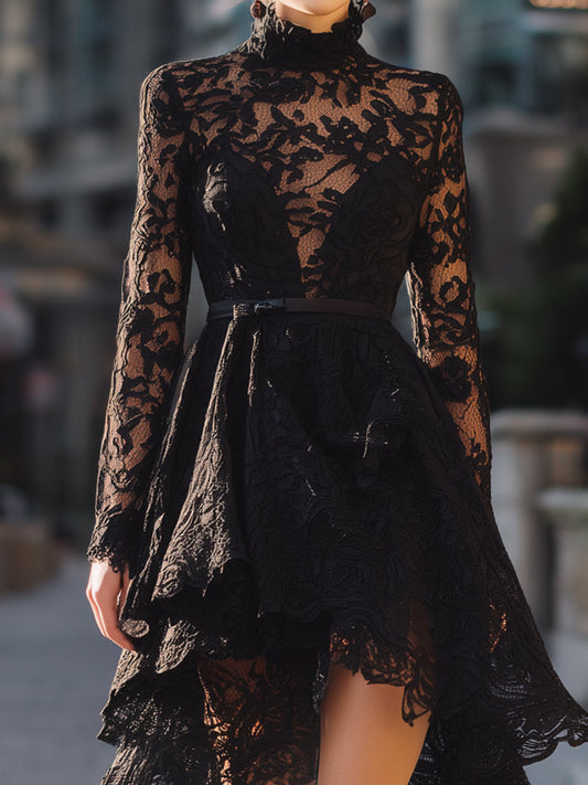 Long-Sleeve Asymmetric Ruffle Dress With Lace Contrast