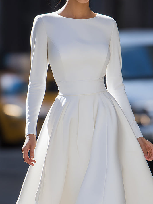Ivory Long-Sleeve Midi Dress With Flared Skirt