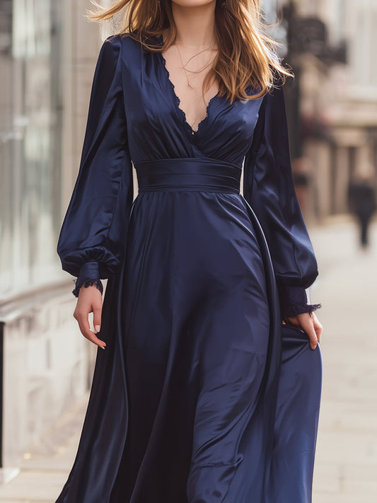 Midnight Navy Satin Maxi Dress With Lace Trim